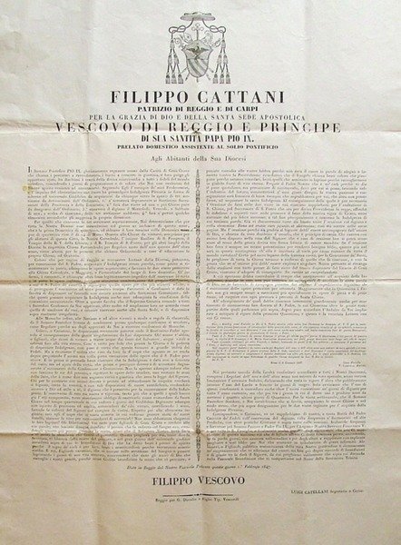 Bando di Indulgenza Plenaria. Filippo Cattani, patrizio di Reggio e di carpi per la grazia di Dio e della Santa Sede Apostolica Vescovo di Reggio e Principe di Sua Santità Papa Pio IX.
