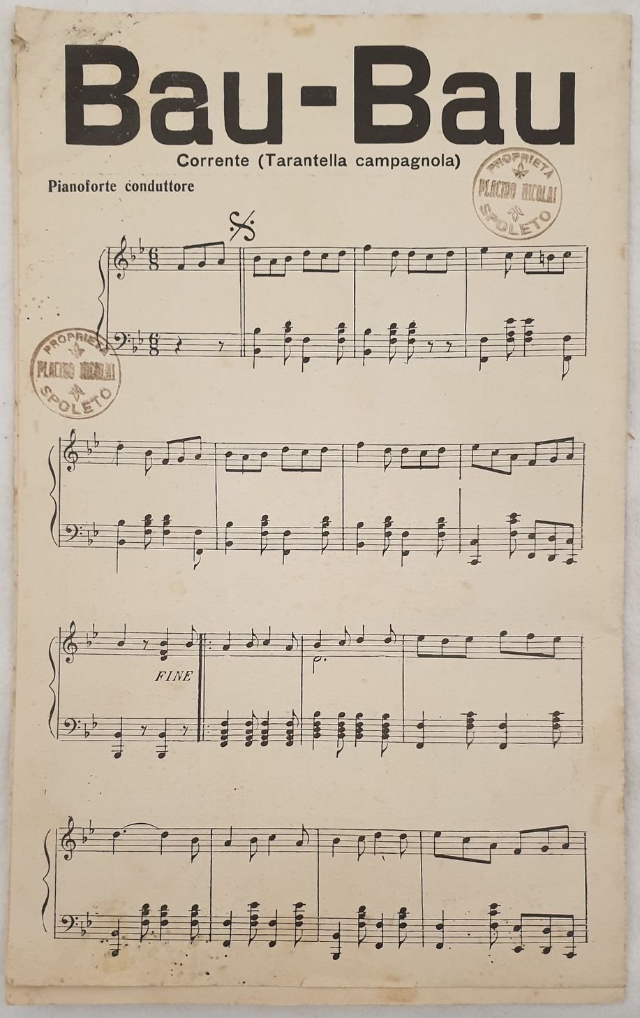 Partitura per orchestra del 1931 delle melodie "Bau bau" "Chicchirichi", "be.e.e" e "coccode" di Marius 1° e Chiappo. Copertina assente. GENERE: Tarantella, polka STRUMENTI: pianoforte, violini; basso ANNO: 1931 DIMENSIONI: In 8. cm 26,5x17 PAGINE: pp. 12 CONDIZIONI: Buone condizioni. Ex libris. Complete score for orchestra of 1931 of the melodies "Bau bau" and "Chicchirichi" by Marius 1° and Chiappo.Cover lacks. MUSIC: Tarantella, polka STRUMENTI: piano, violin; bass YEAR: 1931 SIZE: In 8. cm 26,5x17 PAGES: pp. 12 CONDITIONS: Good conditions. Ex libris