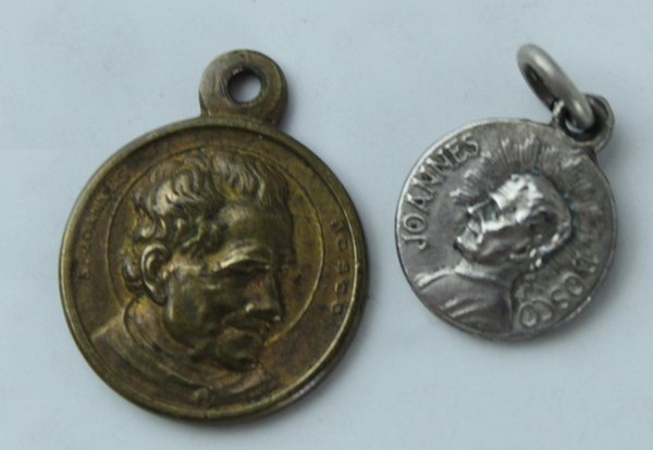 (Codice RE/8131) Placchetta in metallo argentato (diametro cm 3), medagliette, spilla, 2 ritrattini con cornice in metallo, minuscola medaglietta in argento (1 cm). Immagine di Maria Ausiliatrice al retro di alcuni oggetti. ~~~ SPEDIZIONE IN ITALIA SEMPRE TRACCIATA