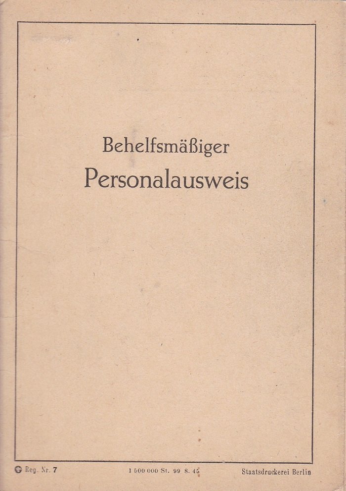 Der Behelfsausweis wurde im November 1945 ausgestellt und gehörte einem Mann aus Berlin-Wilmersdorf. Er enthält übliche Eintragungen und mehrere Polizeistempel. Beeindruckend ist die Aufrechterhaltung der öffentlichen Verwaltung in einer so stark zerstörten Stadt kurze Zeit nach Kriegsende. Original-Zeitdokument!