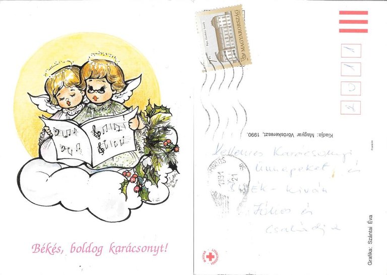 Békés, boldog karácsonyt. Angioletti con lo spartito. Viaggiata 1991