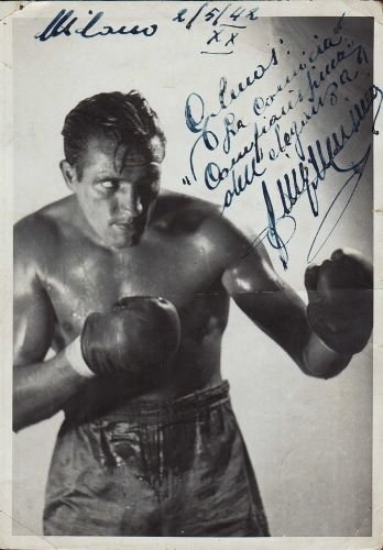 Bella e rara fotografia in bianco e nero con dedica autografa firmata del campione mediomassimo italiano di boxe. Cm. 18,5x13. Piccoli marginali difetti. (Goriziano nato nel 1914 e scomparso nel 1990, è stato un grande campione di pugilato. Una vita tra vittorie e miseria. Musina è il pugile che sconfigge Primo Carnera per tre volte, tra l'autunno del '945 e la primavera del '946 che comporterà la fine della carriera sul ring del gigante di Sequals).