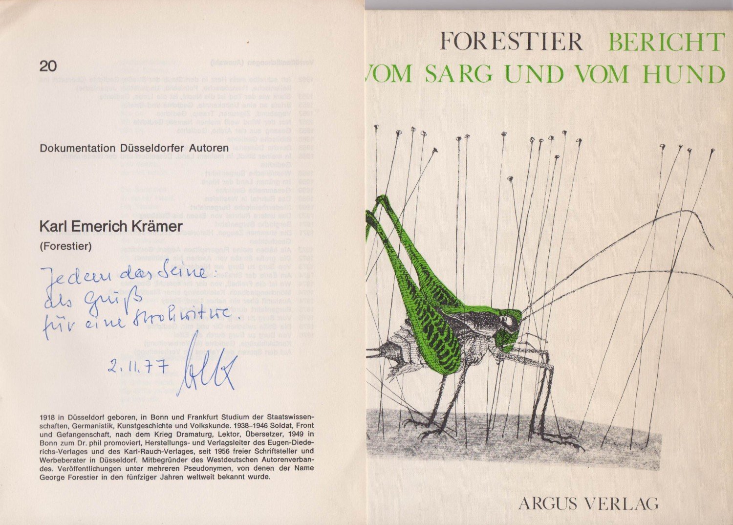 Numeriert (II/1) und mit signierter Widmung von Karl Emerich Krämer. Mit Beilage: "Dokumentation Düsseldorfer Autoren: Karl Emerich Krämer (Forestier)", hier mit monogrammierter Widmung.
