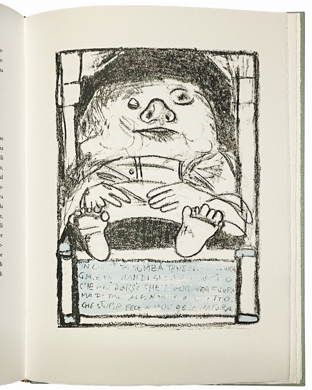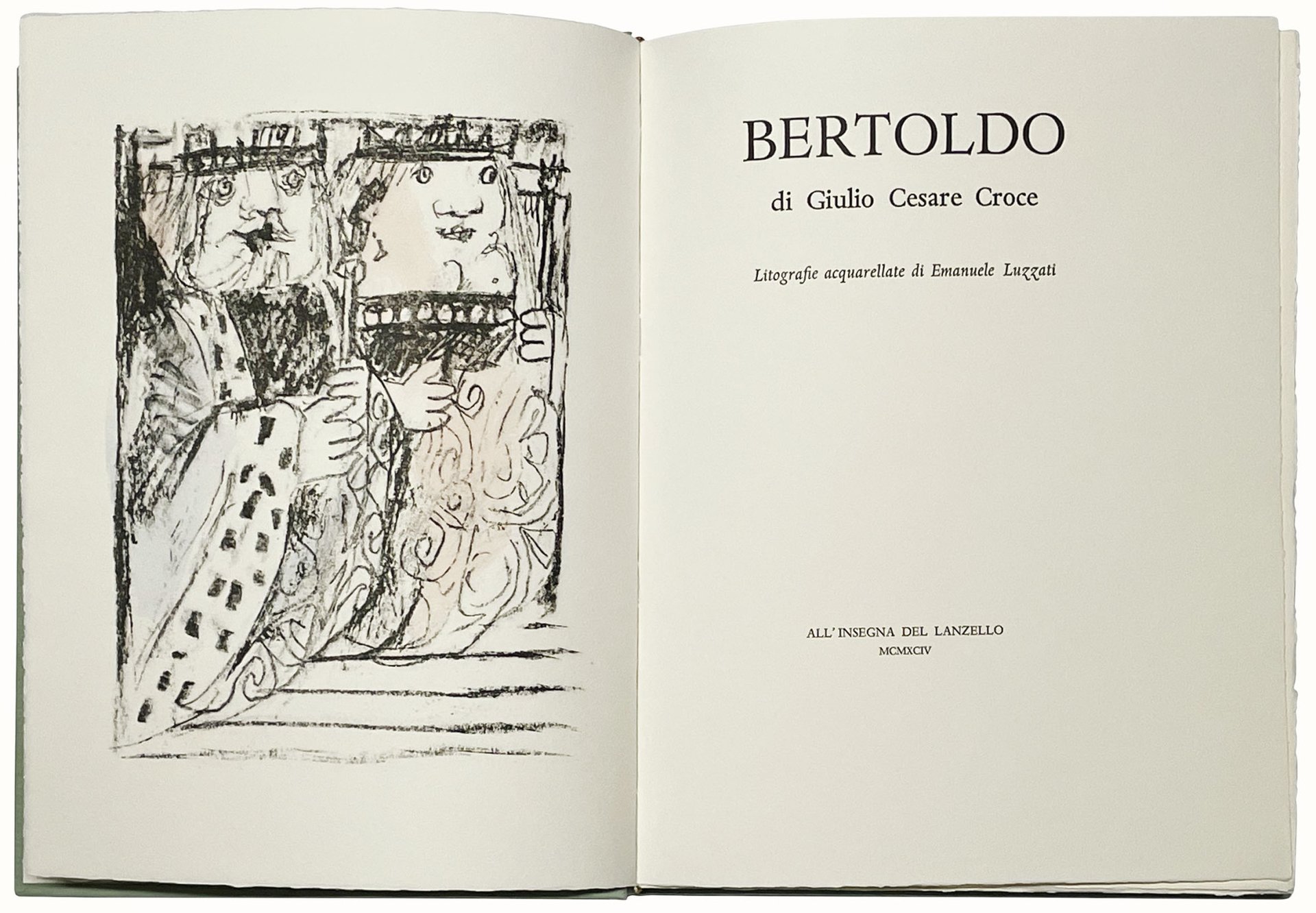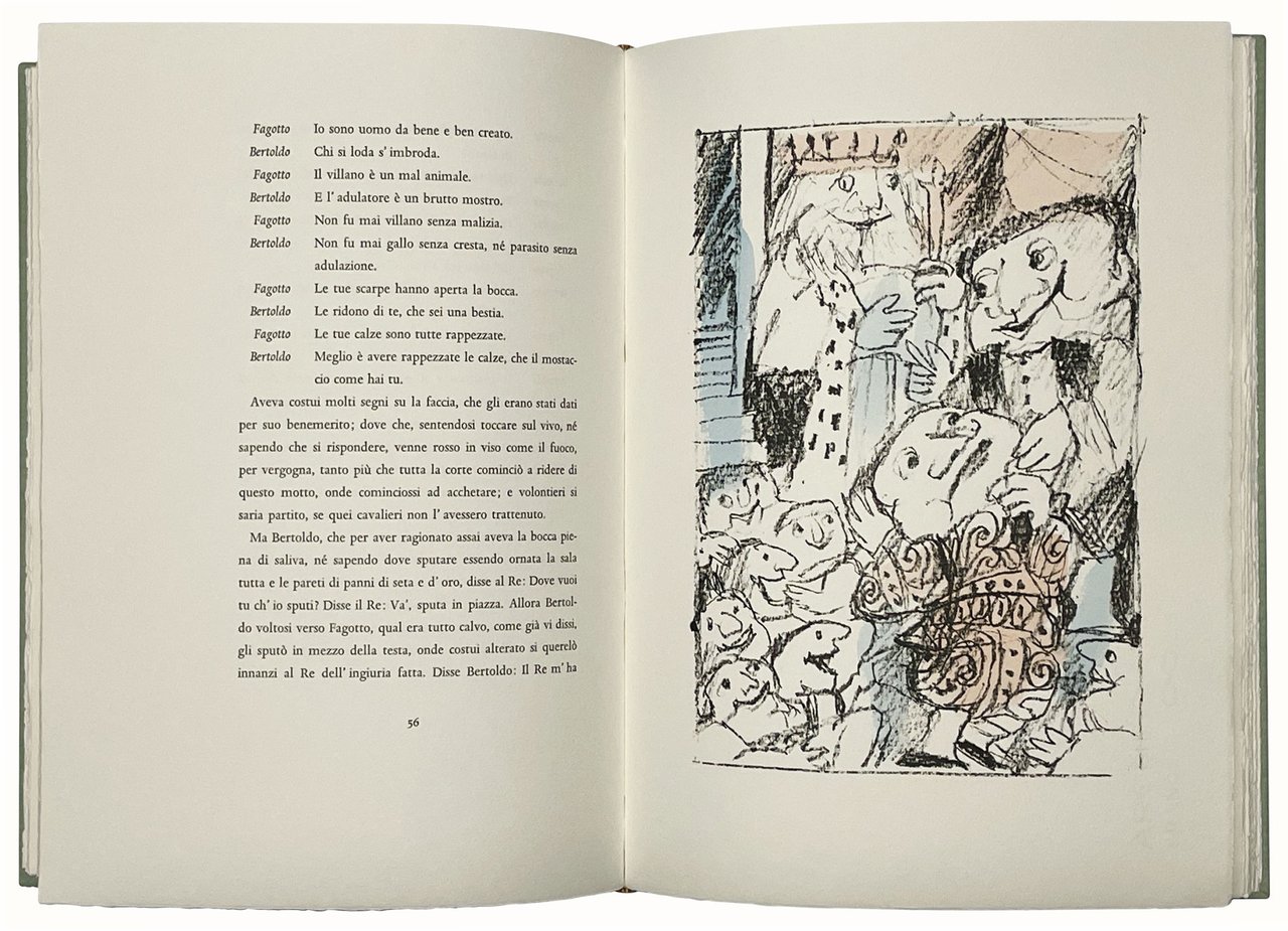 Mm. 327x250. Pp. 135, [9]. Con 26 litografie originali a colori acquarellate a mano nel testo, di cui 12 a piena pagina, di Emanuele Luzzati. Cartonato editoriale verde acqua con titolo al dorso, in custodia editoriale. Presente anche il cartoncino protettivo originale. Edizione stampata a torchio su carta Velin d'Arches in tiratura limitata di 150 esemplari numerati e firmati al colophon dall'artista (ns copia nr. 62). Ottima copia di questa elegante edizione opera del noto stampatore costigliolese, con le litografie di Emanuele Luzzati che accompagnano il famoso testo seicentesco di Giulio Cesare Croce.