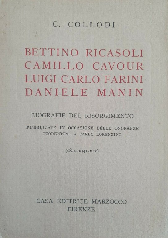 Bettino Ricasoli. Camillo Cavour. Luigi Carlo Farini. Daniele Manin. Biografie del Risorgimento pubblicate in occasione delle onoranze fiorentine a Carlo Lorenzini.