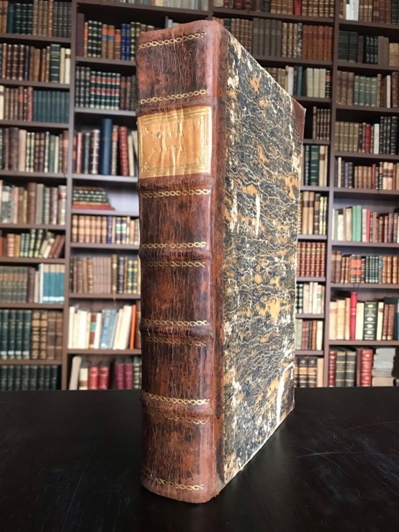 <span style="font-style: normal;">In-folio (cm. 37,8), legatura del XVIII secolo in mezza pelle con titolo in oro su tassello e sobri fregi in oro al dorso (leggere abrasioni ai piatti), tagli spruzzati; pp. [16] 792, 62 in ottimo stato, frontespizio con titolo e vignetta in silografia (San Girolamo) inquadrati entro una ricca cornice silografica, testo su due colonne entro filetto tipografico, 610 belle vignette in silografia n.t. realizzate da disegni di Hans Holbein, Bernard Salomon e Pierre Eskrich, capilettera ornati. Frontespizio con integrazione a un angolo, alcuni leggeri arrossamenti della carta, foro di tarlo al margine inferiore bianco dei soli ultimi fascicoli senza fastidio e delle ultime due carte. Prima edizione dell'importante bibbia illustrata del Bevilacqua, che seguiva la revisione testuale dei teologi di Lovanio, con il testo della </span><i>Vulgata</i> curato dal domenicano Jean Henten. E' uno dei più cospicui tentativi cattolici di offrire una risposta biblica dopo la proibizione delle nuove edizioni, fra le quali quella dell'Estienne. Da sempre stimata per l'abbondanza e la bellezza delle immagini. Cfr. Lumini 48; Graesse I, 395; Mortimer I, 62. Ottimo esemplare. (SD3)