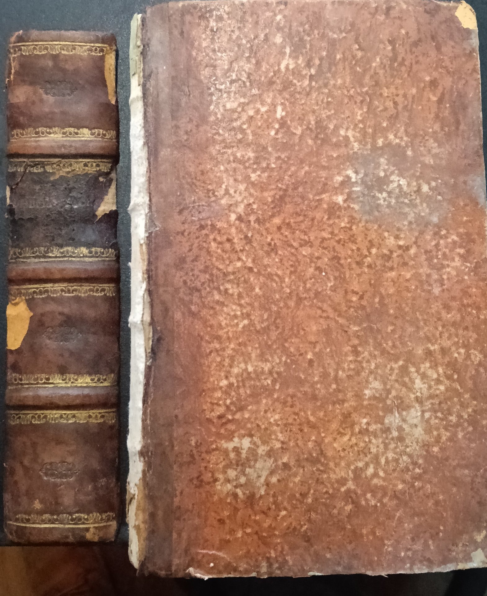 Legatura in pelle marrone con dorso a tre nervi. Dorso completamente staccato ma presente, abrasioni ai piatti e al dorso, interno molto buono, stato accettabile. Bibbia in latino
