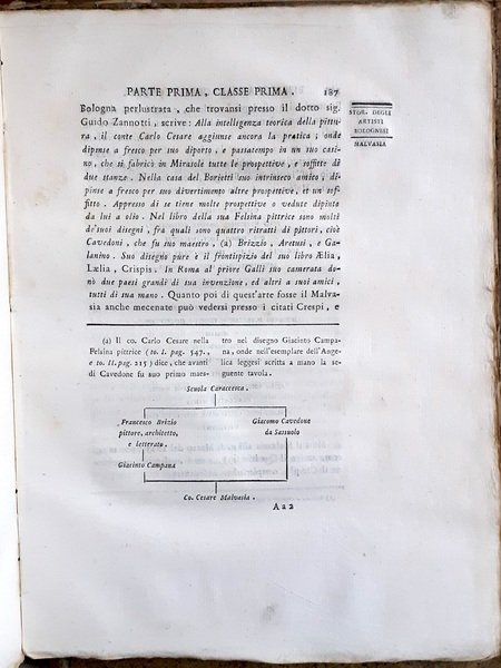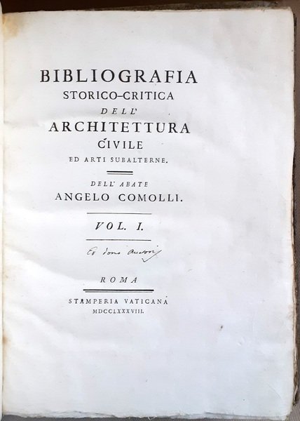 In -4°, quattro voll.; cartonato d’epoca. esemplare in barbe, esemplare ex dono auctoris al primo e secondo volume. Prima rara edizione di quest’opera che è considerata la prima vera e propria bibliografia dell’architettura. Concepita come più ampia, i lavori s’interruppero per la scomparsa prematura di Comolli. Cicognara (2152) scrive: “Nessun libro sarebbe più utile di questo agli amatori e agli artisti, se l'autore rapito dalla morte avesse potuto condurlo al suo termine”. Copia estremamente bella, con l’invio autografo del Comolli.In -4 °, four volumes .; contemporary cardboard with deckle edges. Ex dono auctoris copy. Rare first edition of this work which is considered the first real bibliography of architecture. Conceived as larger, the works were interrupted by the premature death of Comolli. Cicognara (2152) writes: “No book would be more useful than this to amateurs and artists, if the author kidnapped by death could have brought it to its end”. Extremely beautiful copy, with Comolli’s autograph.
