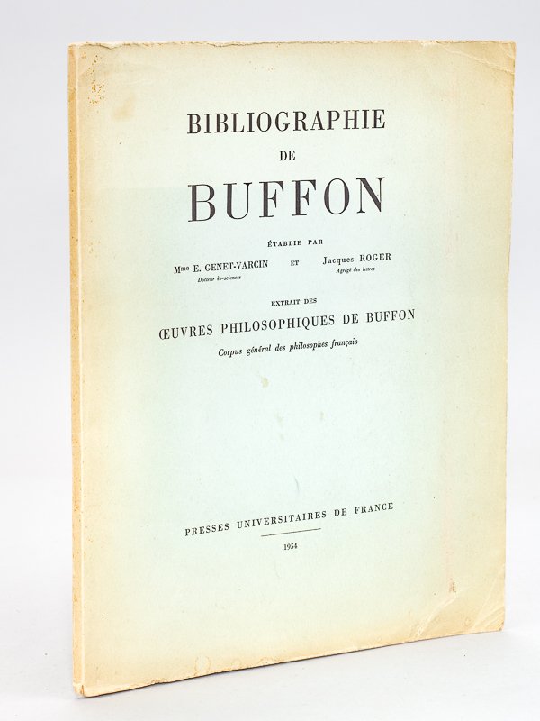 Etablie par Mme E. Genet-Varcin et Jacques Roger, Extrait des Oeuvres Philosophiques de Buffon, Corpus Général des Philosophes Français, 1 vol. in-4 br., Presses Universitaires de France, Paris, 1954, pp. 514-565 Bel exemplaire en parfait état de ce tiré à part dédicacé par Jacques Roger "à Mademoiselle Giraud, Docteur es sciences bibliographiques, Hommage respectueux". Rare.