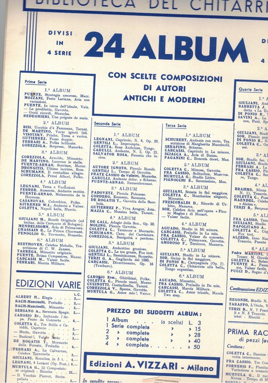 Biblioteca del chitarrista quarta serie in 6 album che contengono spartiti di: Giuliani, Barbetta, Di Ponio, Savini, Coletta, Ferrari, Fra Cassio, Brahms, Haendel, Terzi, Napolitano, ecc. di alcuni ci sono più brani.