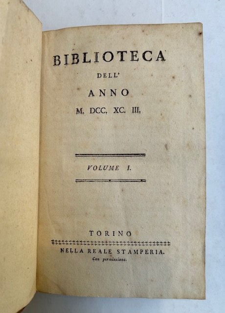 3 voll. in-12°, pp. VII, 296; 300; 300, legatura in mezza pelle dell'epoca, titolo su tassello cartaceo. Ex libris del conte Cibrario. Dalla prefazione: 'Già volge il settimo anno, dacchè si pubblica il presente Giornale, sebbene prima col titolo di Biblioteca Oltremontana ed ora semplicemente biblioteca. Troppi sono i libri, che escono giornalmente alla luce per potersi assumere l'impresa di parlar di tutti. Non già semplici notizie ed annunci, ma estratti per lo più ragionati da noi si daranno de' libri. Si farà estratto eziandio talvolta di opere, ch emeritar possano censura, qualora si tratterà di autore che abbia levato rumore.andremo assai ritenuti nel recar giudizio dell opere, nel sostener opiniono diverse da quelle degli autori. per rendere l'opera più curiosa ed istruttiva crediamo opportuno di non eslcudere dalla Biblioteca le analisi de' libri non recentissimi ed anche di libri usciti alla luce molti anni addietro.'