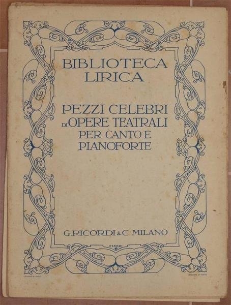 In folio. Dim. 34,5x26 cm. Pp. 8. Bello spartito per pianoforte del pezzo di musica lirica "I Lituani" di Amilcare Ponchielli della serie "Pezzi celebri di opere teatrali per canto e pianoforte" Data su timbro a secco Ricordi febbraio 1926. Bella brossura editoriale decorata da Cisari. In buone condizioni. Brossura editoriale in buone condizioni generali con lievi usure ai margini e dorso. Piatti in parte staccati. Legatura assente. All'interno le pagine si presentano in buone condizioni con fioriture. Beautiufl musical score for piano of the lyric piece "i Lituani" by Amilcare Ponchielli of the series "Pezzi celebri di opere teatrali per canto e pianoforte". Embossed stamp Ricordi february 1926. Beautiful editorial cover illustrated by Cisari. In good conditions. Editorial cover in good general conditions slightly worn in the edges, plates and spine. Plates are partially detached. Binding is missing. Inside pages are in good conditions with foxings.