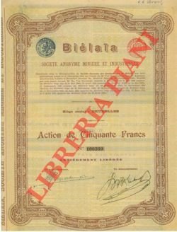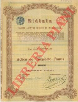 Certificato d'azioni da 500 franchi, in rosso. Bruxelles, 1905, completo di cedole.