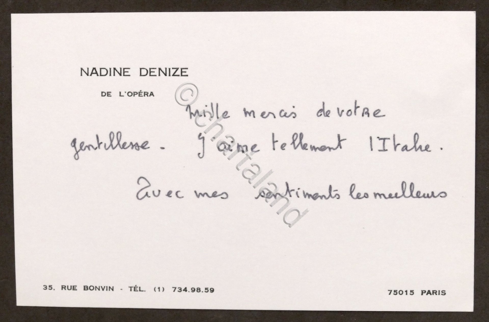 Biglietto manoscritto (senza firma) dalla cantante mezzo soprano francese Nadine Denize - anni '80 Dimensioni: 8 x 13 cm ca. Condizioni molto buone.