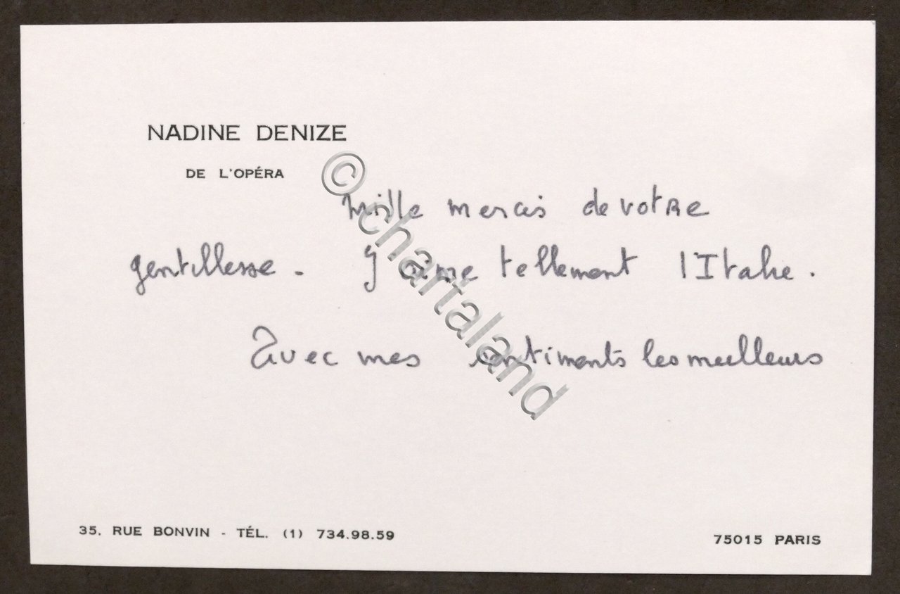 Biglietto autografo della cantante mezzo soprano Nadine Denize - anni '80