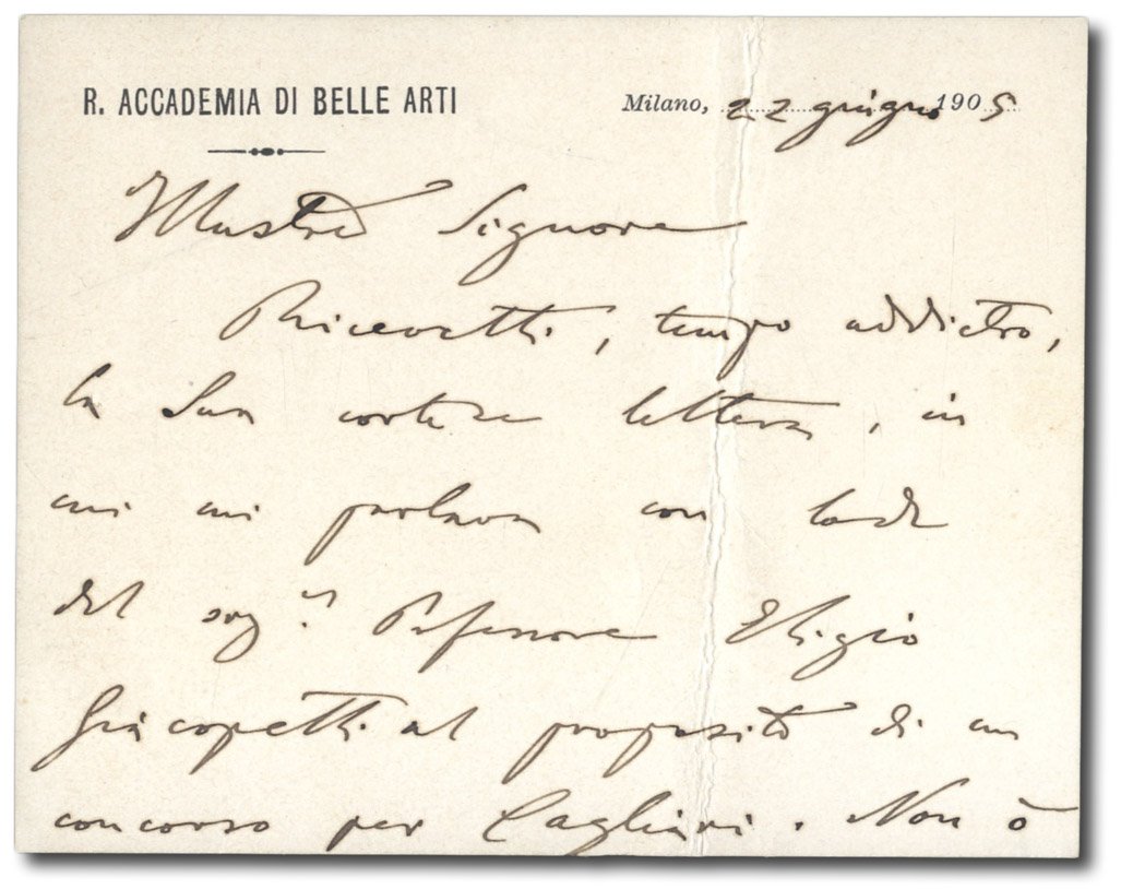 >1 biglietto (cm 10x12) su carta intestata ''R. Accademia di Belle Arti'', vergato al recto e al verso, in cui il celebre architetto e scrittore (1836-1914) declina l'invito a far parte di una commissione per un concorso a Cagliari.
