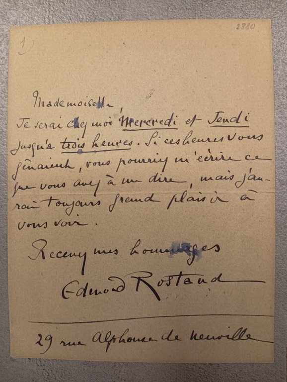 Biglietto autografo firmato ad anonima "Mademoiselle"