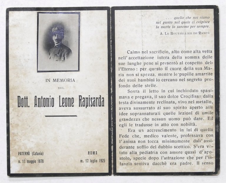 Biglietto Commemorativo in memoria del Dott. Antonio Leone Rapisarda - 1925