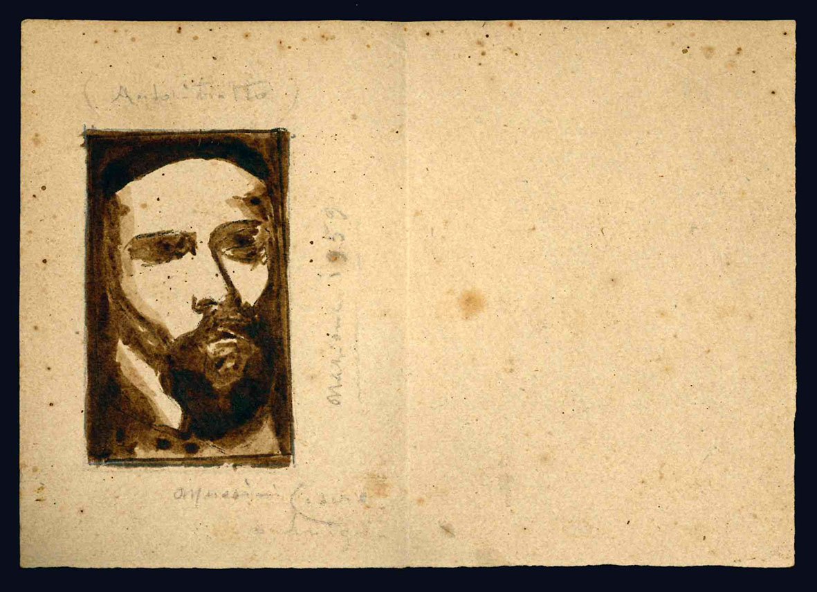 - Autoritratto (mm 68x42) a matita e acquarello, al verso della prima carta di un piccolo bifolio (mm 111x79). Bianco il recto della prima carta e la seconda carta. Datato a matita 1959.