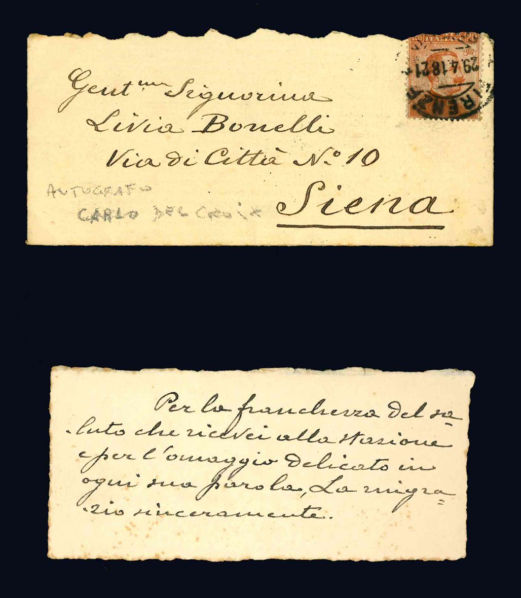- Busta viaggiata indirizzata alla Sig.ra Livia Bonelli di Siena contenente il biglietto da visita (mm 50x110) di Carlo Delcroix. Al verso del biglietto, vergati a mano i ringraziamenti di Delcroix alla signora Bonelli;