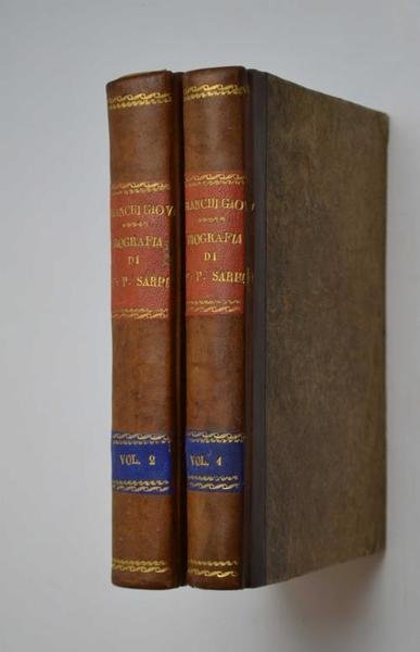 Due volumi di cm. 18, pp. (4) 361 (1); (4) 420. Ritratto del Sarpi inciso in rame all'antiporta del primo volume. Solida legatura coeva in mezza pelle, dorsi lisci con filetti e titoli in oro su doppio tassello bicolore. Buona conservazione. Non comune edizione di questa celebre ed interessante biografia.