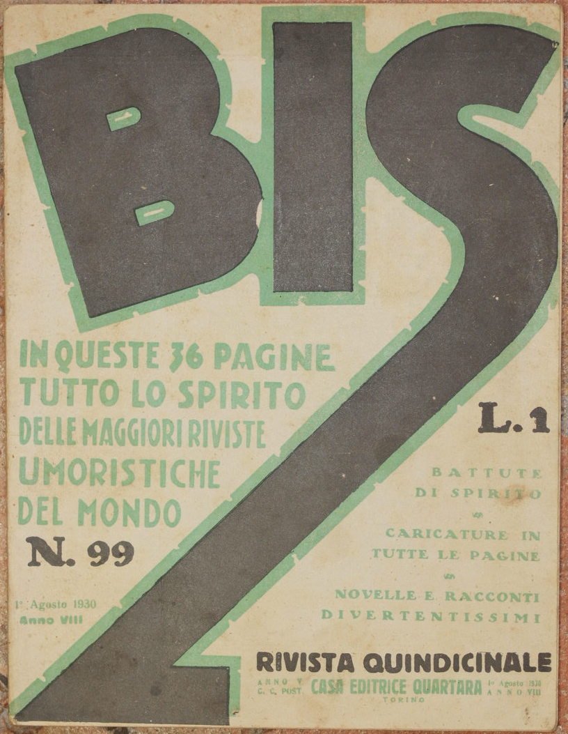 In 8. Dim. 24x18 cm. Pp. 34. Numero del 1 agosto 1930 di questa rivista umoristica "Bis". All'interno: Avventura amorosa con la prima attrice, Il Renard argentè, I cinque atti della signora e un epilogo inatteso, Il fortunato vincitore, Teodoro cerca i fiammiferi, La lettura interrotta, Gli otto denti, Il telescopio sul grattacielo, Il più piccolo coscritto di Francia ecc. All'interno illustrazioni di Joseph Morgan, Georges Courteline ecc. Numerose pubblicità d'epoca. Brossura editoriale originale. In buone condizioni. Brossura editoriale in buone condizioni generali con lievi usure e parti mancanti ai margini e dorso. Fioriture. Legatura in buone condizioni. Pagine in buone condizioni con rare fioriture. Number of the 1st of august 1930 of this magazine of humour. Inside: Love adventure with first actress, Il Renard argentè, I cinque atti della signora e un epilogo inatteso, Il fortunato vincitore, Teodoro cerca i fiammiferi, La lettura interrotta, Gli otto denti, Il telescopio sul grattacielo, Il più piccolo coscritto di Francia ecc. Inside illustrations Joseph Morgan, Georges Courteline. Different advertisings. Editorial original cover. In good conditions. Editorial cover in good general conditions slightly worn in the edges and spine. Foxings. Binding in good conditions. Pages are in good conditions with occasional foxings.