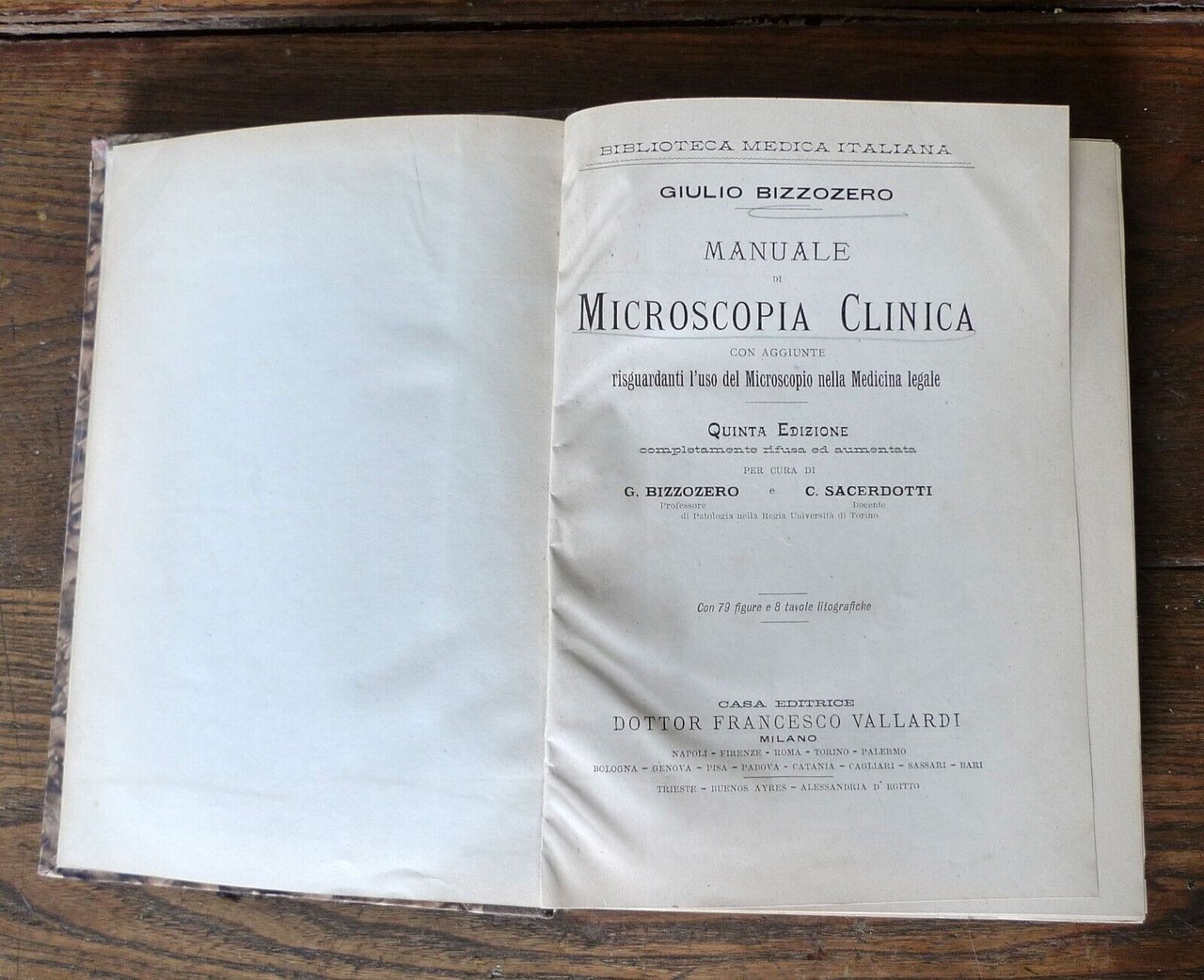 Giulio Bizzozero,MANUALE DI MICROSCOPIA CLINICAcon aggiunte riguardanti l'uso del Microscopionemma Medicina Legale.QUINTA EDIZIONE completamente rifusa ed aumentataper cura di G.Bizzozero e C.Sacerdoti,Con 79 figure e 8 tavole litografiche.Casa Editrice Dottor Francesco Vallardi, Milano 1901,copertina rigida, rilegatura posteriore in mezza tela,23x16,5 cm., pp.XIV-430,con illustrazioni nel testo in neroe su tavole fuori testo in nero e a colori,collana BIBLIOTECA MEDICA ITALIANA,peso: g.900