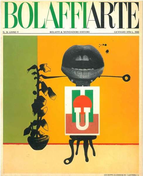 Bolaffiarte. Rivista mensile di informazioni. Anno V, n. 36, gennaio 1974. Direttore: Umberto Allemandi. Due riproduzioni fotolitografiche: "La lettera U", espressamente eseguita per la collezione: "L'alfabeto" in 5000 esemplari 9 colori offset, di Giuse