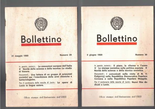 Bollettino dell'ufficio stampa dell'Ambasciata dell'Urss. Disponiamo dei n° di maggio e goiugno 1969. Una lettera di scienziati sovietici per l'interdizion delle armi chimiche e batteriologiche; la stampa sovietica sulla politica maoista; ecc.