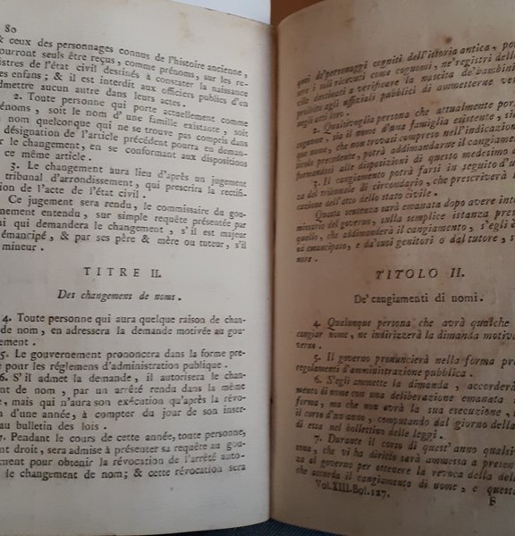 In-4°; pp. (1), da 50 a 84, e cc. da 85 a 88. Testo in italiano e a fronte in francese. Legatura in cartonato.