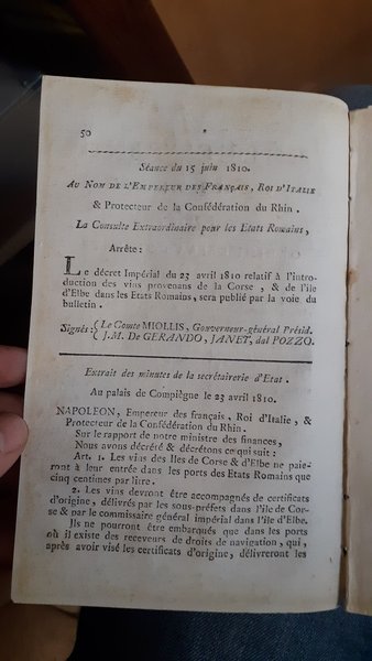Bollettino delle leggi n. 127 ordini della consulta. Pubblicazione del dec. imp. sull’introduzione negli stati romani dei vini provenienti dalle isole di Corsica e d’elba. pubbl. di vari leggi e decreti relativi alle proprietà letterarie. Pubbl. di alcuni decr. imperiali unitamente ad un regolamento relativo agli ebrei. ordine risguardante lapolizia de’ fossi vicino alle strade pubbliche vicinali