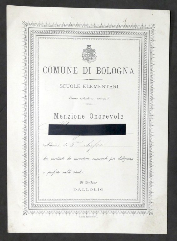 Bologna - Scuole Elementari - Diploma di Menzione Onorevole - Anno 1900 / 1901