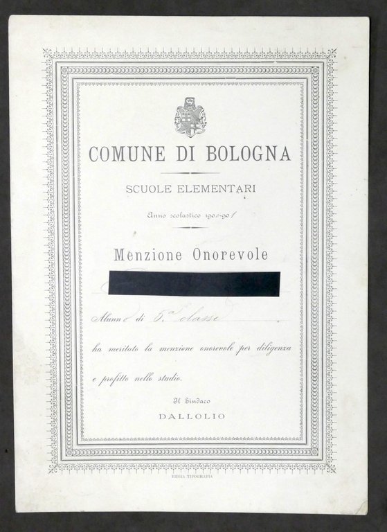 Bologna Scuole Elementari - Diploma di Menzione Onorevole - Anno 1900 / 1901