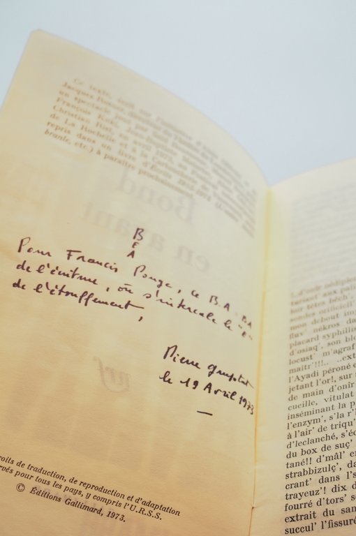 Gallimard | Paris 1973 | 13 x 20.50 cm | agrafé | [ENGLISH DESCRIPTION ON DEMAND] | Edition originale strictement hors commerce et imprimée à petit nombre. Rare et agréable exemplaire.  Bel envoi autographe signé de Pierre Guyotat : B  E  A Pour Francis Ponge, ce B.A. = BA de l'écriture, où s'intercale le E de l'étouffement, Pierre Guyotat, le 19 Avril 1973.