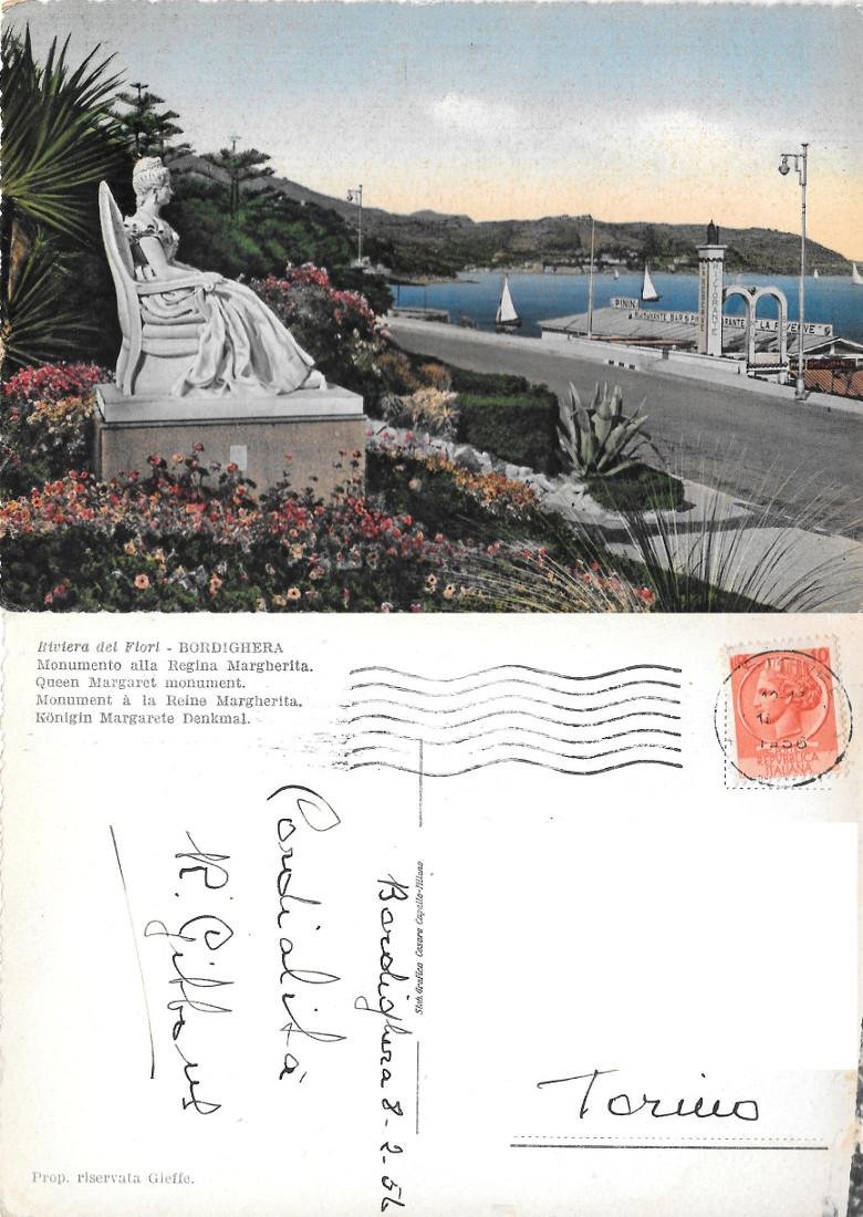 Bordighera (IM). Monumento alla Regina VIttoria. Viaggiata 1956