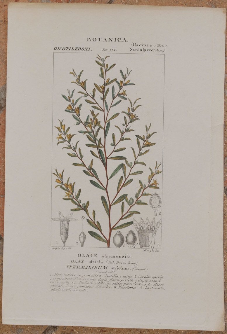 Eccellente incisione creata dal maestro Pierre Jean Francis Turpin. Le scritte indicanti la specie e la descrizione della pianta o animale sono in italiano e/o latino, e provengono dalla prima edizione italiana del Dizionario di scienze naturali edito da Battelli nel 1831. Quest'opera imponente era composta da 29 volumi ed era corredata da centinaia di incisioni che rappresentavano tutto il mondo animale e vegetale. L'opera deriva da un eccellente lavoro di luminari del XVIII secolo supportati dal Re francese Louis XV in seguito guidati dallo stesso Turpin, considerato al tempo il più grande incisore di botanica. La maggior parte delle incisioni sono firmate Turpin & Pretre. Le incisioni sono veramente eccezionali con una grande dovizia di particolari e dipinte a mano. Carta bianchissima e resistente di ottima qualità. Formato foglio: cm 25,5x17,5. Formato incisione: cm 15,5x9 Autore: Stanghi su disegno di Turpin In buone condizioni. Superb engraving made by the master Pierre Jean Francis Turpin. The engravings are written in latin and italian and come from the first italian edition of Dictionary of natural sciences edited by Battelli in 1831. This imponent work was made up by 29 volumes and contained hundreds of engravings that represented all the plant and animal kingdom. This work derives from an excellent work of luminaries of the 18th century supported by the french King Louis XV and then directed by the same Turpin that was considered as the greatest botanical engraver of his time. The most of his engravings are signed Turpin & Pretre. The engravings are made in an excellent way with fine details and coloured by hand. Very white strong paper of good quality. In good condition. Page size: cm 25,5x17,5. Print size: cm 15,5x9 Author: Stanghi upon drawing of Turpin In good conditions.