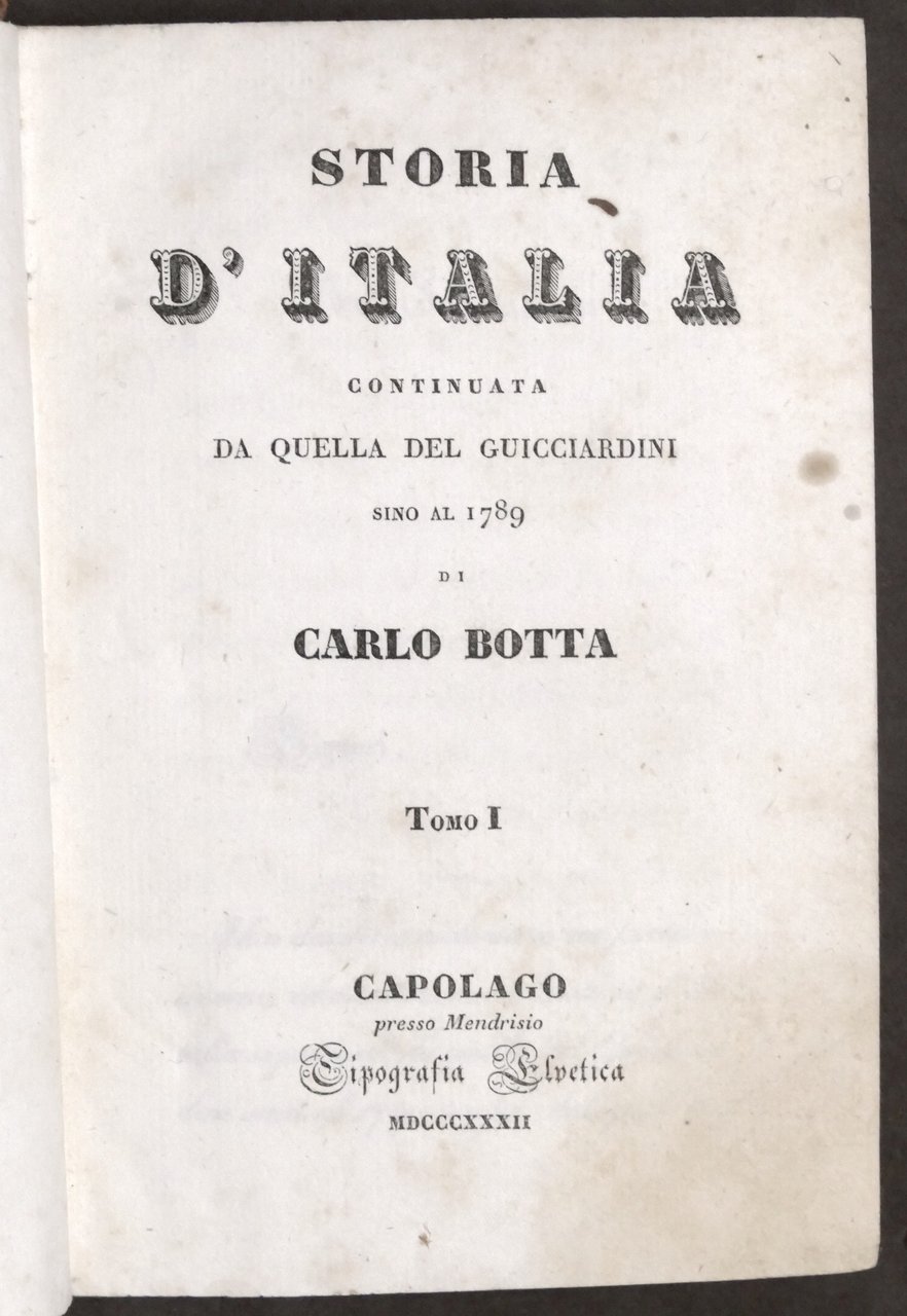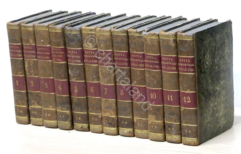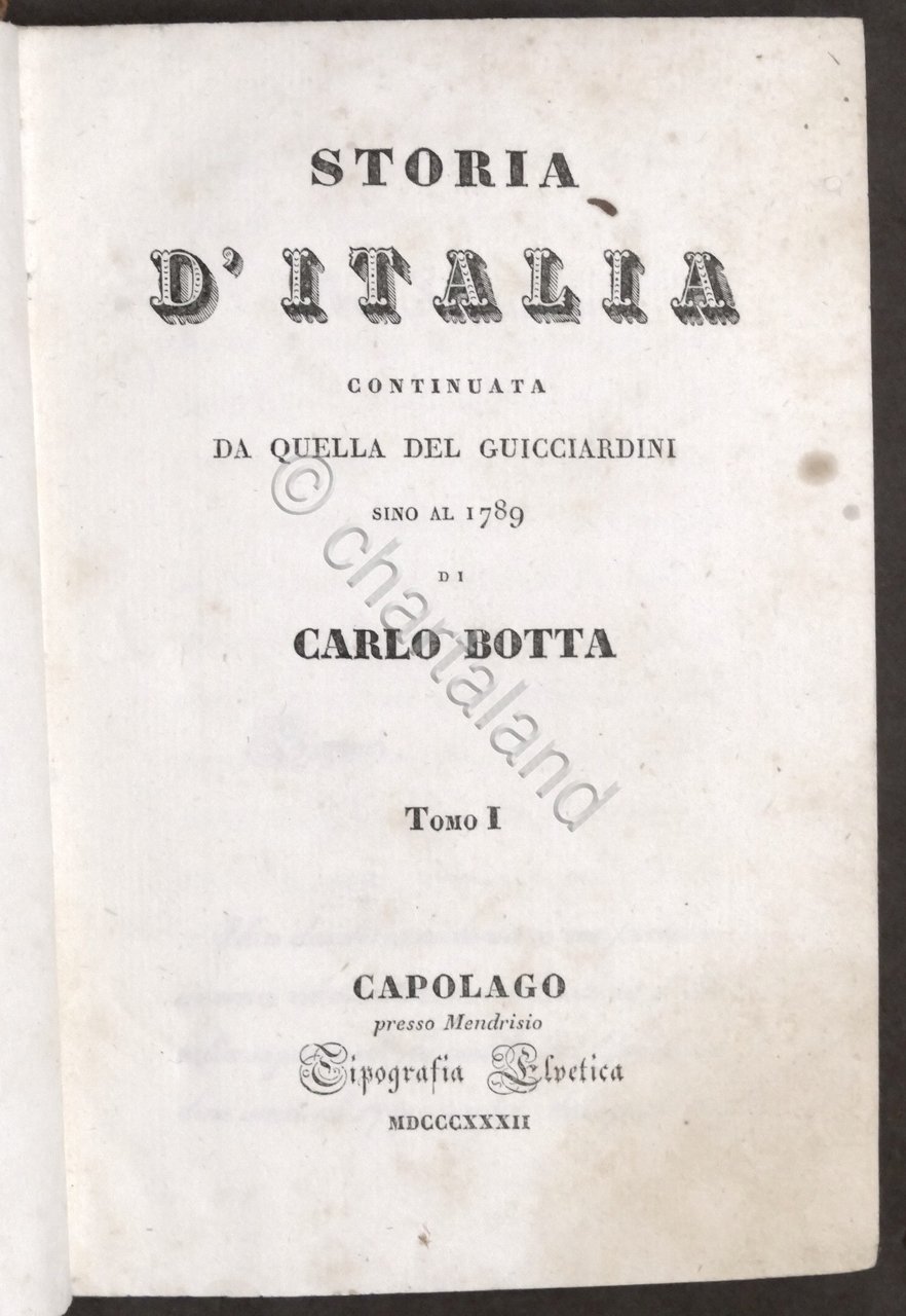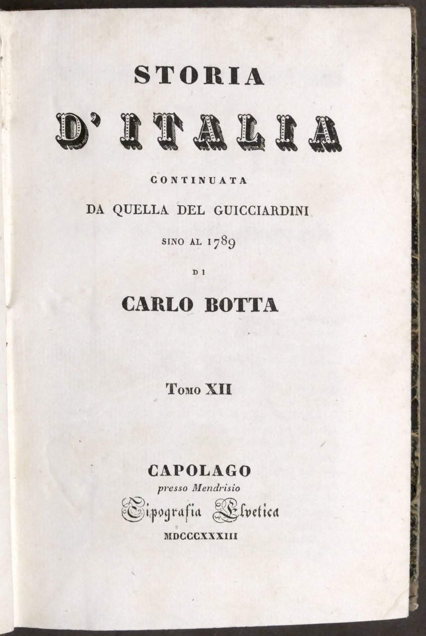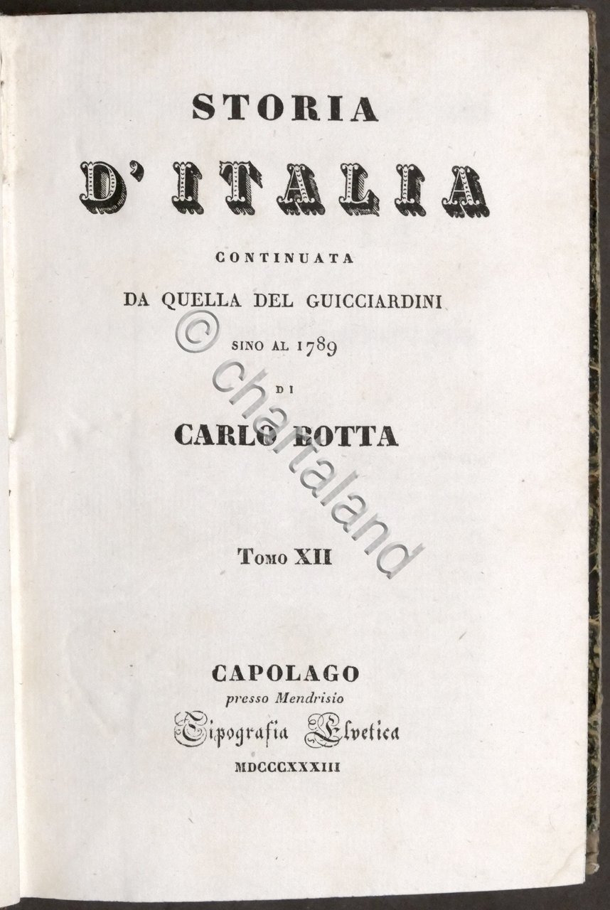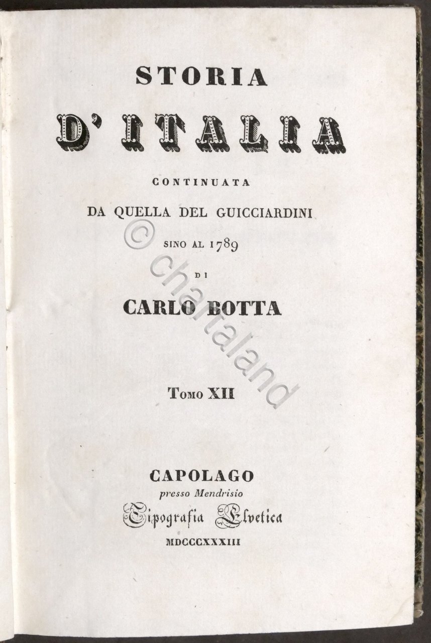 Carlo Botta - Storia d'Italia continuata da quella del Guicciardini sino al 1789 - ed. 1832 / 1833 Capolago, Tipografia Elvetica Opera completa in 12 volumi Pag. 372; 395; 394; 405; 433; 384; 384; 388; 392; 406; 408; 421. Legatura in mezza pelle - Testo in italiano. Condizioni buone. Macchia all'angolo delle prime 20 pagine del quinto volume.