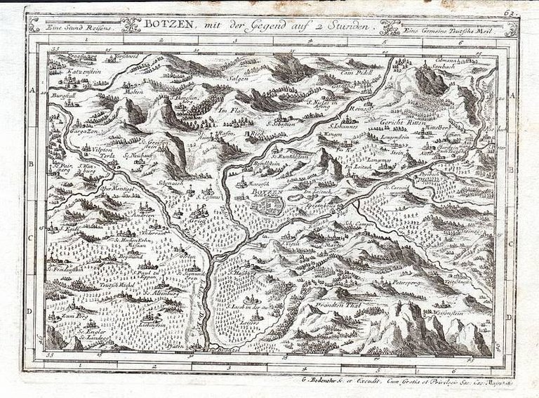Carta geografica dell'estensione territoriale attorno a Bolzano. Incisione in rame, misure all'immagine cm. 22,7x17 più i margini. Buono stato di conservazione.
