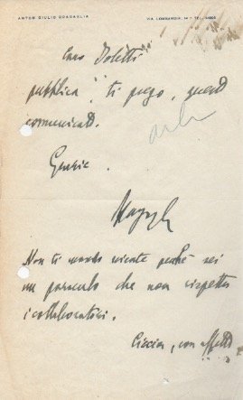 Breve lettera autografa firmata su carta intestata «Anton Giulio Bragaglia — via Lombardia, 14 –tel. 44608», inviata a Mino Doletti