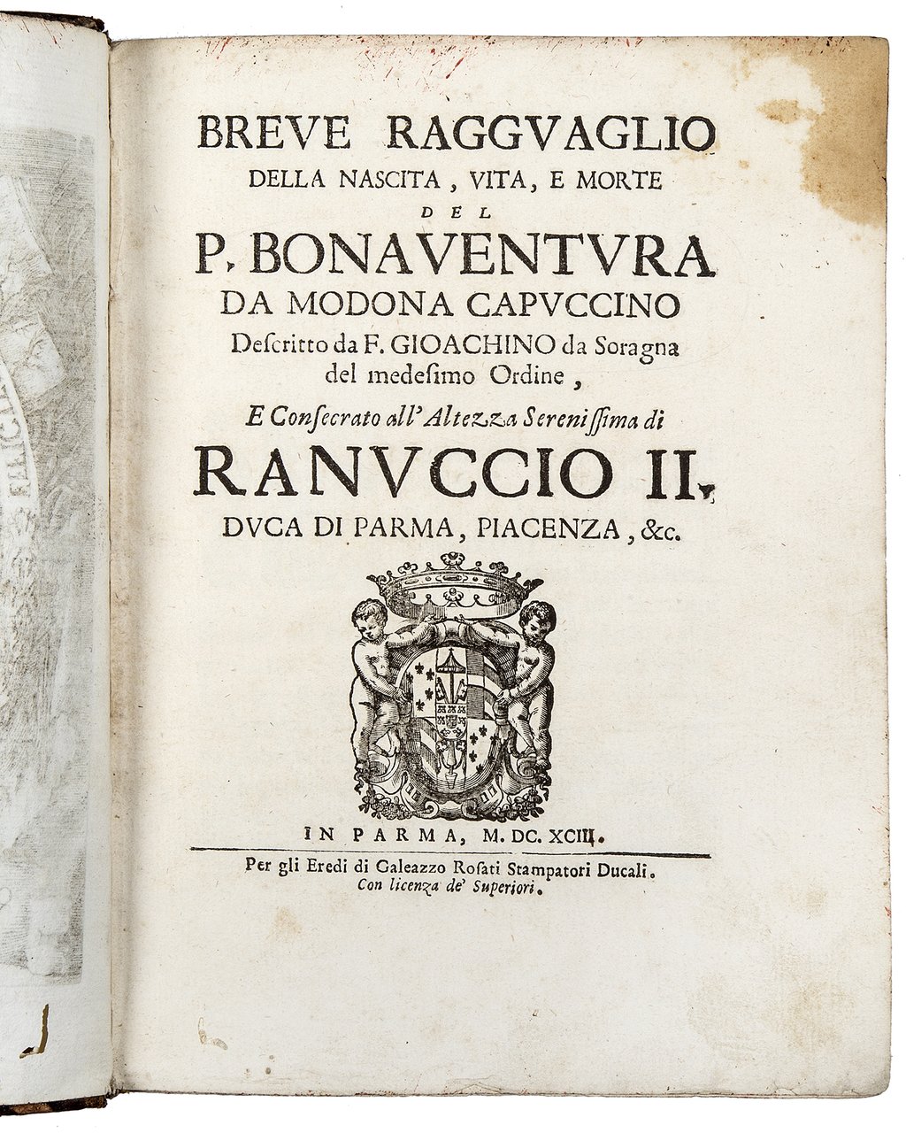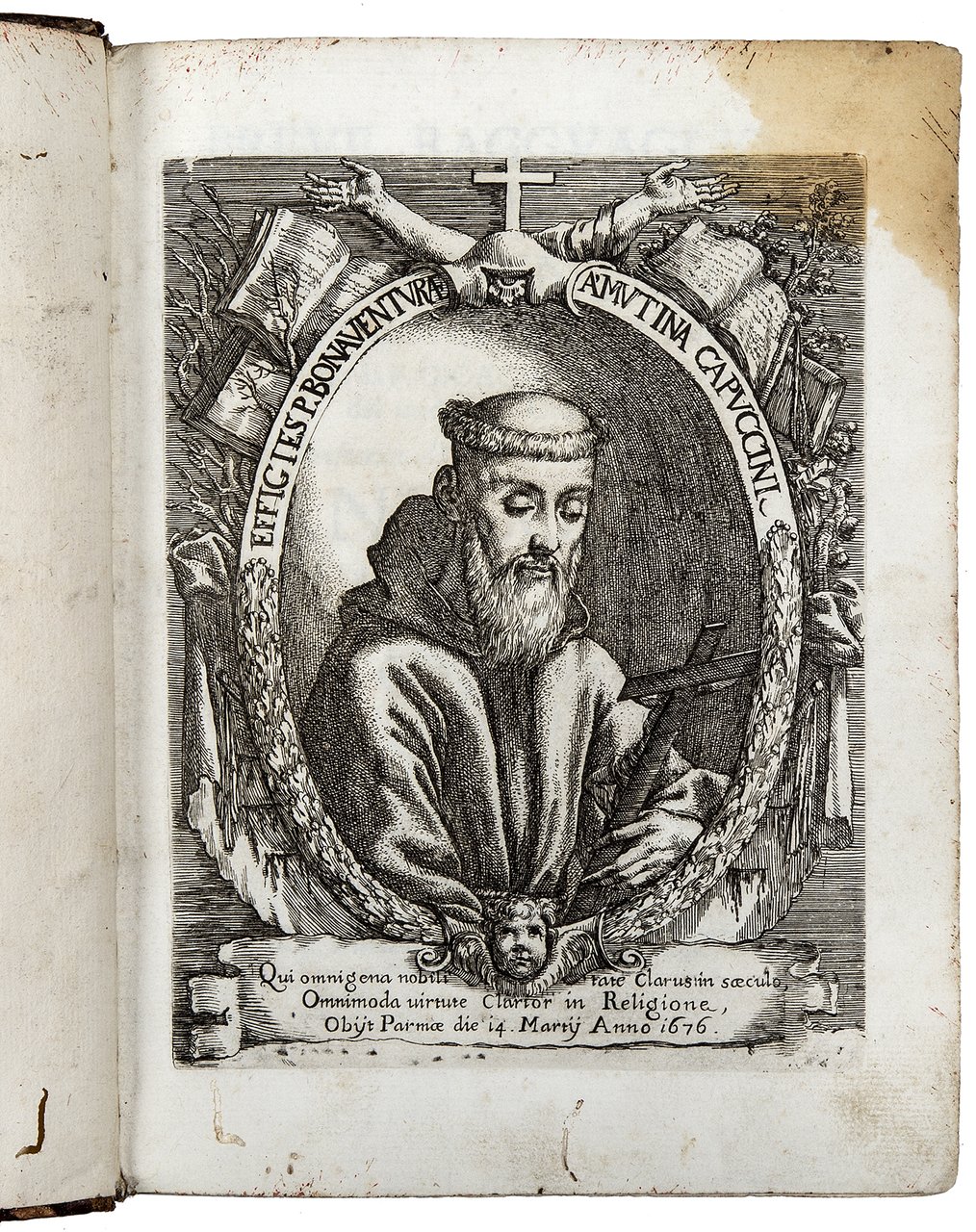 PRIMA EDIZIONE di questa biografia del padre cappuccino Bonaventura da Modena (1619-1676) scritta dal correligionario Gioacchino da Soragna. Bonaventura nacque Ercole Bevilacqua. Conte e paggio di cappa e spada del Duca di Modena, rinunziò alla primogenitura e nel 1641 prese i voti e divenne frate minore cappuccino nel convento di San Bernardino di Piacenza con il nome di Fra' Bonaventura. In seguito fu maestro dei novizi nei conventi di Cesena, Carpi e Modena, padre guardiano del convento di Modena e definitore della Provincia Cappuccina di Bologna 1660.