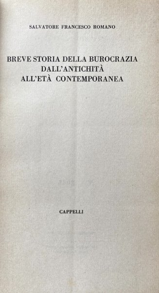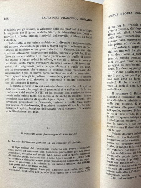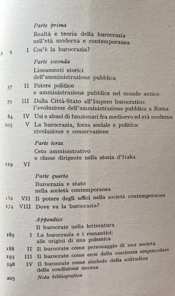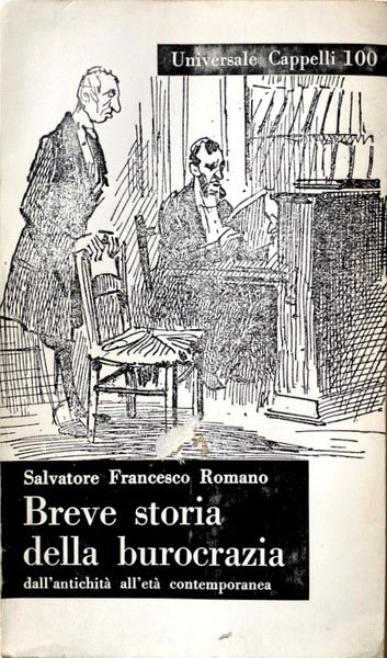 Soggetti: Burocrazia, Storia, Amministrazione pubblica, Storiografia, Studi storici, Politica, Sistema politico italiano, Riforme istituzionali, Riforma elettorale, Stato, Chiesa, Laicità, Interazione sociale in gruppi organizzati gerarchicamente complessi, Funzionari, Impiegati pubblici, Organizzazione, Medioevo, Impero romano, Storia moderna e contemporanea, Letteratura, Romanzi, Descrizioni, Tipi umani, Mediocrità, Assertività, Dipendenti pubblici, Funzioni, Ruoli, Mentalità, Scienze sociali, Sociologia, Classe dirigente, Aristocrazia, Borghesia, Ceto medio, Classi sociali, Arrivismo, Potere, Città, Roma, Rivoluzione, Conservazione, Burocrate, Romanticismo, Polemiche, Personaggi, Coscienza crepuscolare, Obbedienza, Solitudine, Condizione umana, Scrittori, Descrizioni, Commedia, Parodia, Gerarchie, Esercito, Militari, Regno di Napoli, Piemonte, Unità, Milano, Età napoleonica, Magistratura, Antico Regime, Consoli, Podestà, Autonomia, Leggi, Governo, Ceto burocratico, Repubblica, élite, Max Weber, Capitalismo, A. Berle, Gaetano Mosca, Modernità, Imperi, Austria, Germania, Russia, Francia, Italia, Inghilterra, Nazismo, Federico II, Caterina ii, Giuseppe, Prussia, Prestigio sociale, Caserme, Vita militare, Von Kleist, Novalis, Racine, I litiganti, Caricature, Fliegende Blatter, Franz Pocci, Emorroidario, Cancellerie, Ambizioni, Fascicoli, Carte, Pratiche, Ufficio pubblico, Macchina burocratica, Cechov, Morte dell'impiegato, Routine, Formalismo, Regole, Regolamenti, Alienazione, Nikolaj Gogol, Revisore, Contabili, Ispettore Generale, Corruzione, Collusione, Intrighi, Balzac, Cerchia locale, Il cappotto, Biedermeier, Mayer, Congresso di Vienna, Ottocento, Novecento, Settecento, Rabourdin, Ludwig von Mises, Personale, Carriera, Maldicenza, Beau de Lomenie, Giustizia, Luigi Pirandello, Bibliografia, Studi culturali, Libri Vintage Fuori catalogo, Collezionismo, Saggi, Anni Sessanta, Giolitti, Cavour, Fascismo, Socialismo, Comunismo, Stalin, Restaurazione, Finanze, Bibliografia, Decreti, Dogana, Ministeri, Tasse, Dazi, Heinrich Böll, Kafka, Melville, Maupassant, Siegfried Kracauer, Colletti bianchi, Beni patrimoniali, Ufficio statistico comunale, Jean Dézert, Jean de la Ville, Bureaucracy, History, Public administration, Historiography, Historical studies, Politics, Italian political system, Institutional Electoral reform, State, Church, Secularism, Social interaction in hierarchically complex organized groups, Officials, Public employees, Organization, Middle Ages, Roman Empire, Modern contemporary history, Literature, Novels, Descriptions, Human types, Mediocrity, Assertiveness, Public employees, Functions, Roles, Mentality, Social sciences, Sociology, Ruling class, Aristocracy, Bourgeoisie, Middle class, Classes, Achievement, Power, Cities, Rome, Revolution, Conservation, Bureaucrat, Romanticism, Controversy, Characters, Twilight consciousness, Obedience, Loneliness, Human condition, Writers, Descriptions, Comedy, Parody, Hierarchies, Army, Military, Naples, Piedmont, Unity, Napoleonic age, Judiciary, Ancient Regime, Consuls, Autonomy, Laws, Government, Bureaucratic class, Republic, Capitalism, Modernity, Empires, Germany, France, Italy, England, Frederick II, Catherine, Joseph, Prussia, Social prestige, Barracks, Military life, The litigants, Caricatures, Chancelleries, Ambitions, Papers, Practices, Public office, Bureaucratic machine, Chekhov, Death of the employee, Formalism, Rules, Regulations, Alienation, Auditor, Accountants, Inspector General, Corruption, Collusion, Intrigue, The coat, Congress, Nineteenth century, Twentieth century, Eighteenth century, Personal, Career, Maldicence, Justice, Bibliography, Cultural studies, Books Out of print, Collectibles, Essays, Sixties, Communism, Restoration, Finances, Bibliography, Decrees, Customs, Ministries, Taxes, Duties, White-collar workers, Assets, Municipal statistical office