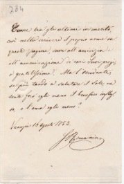 AUTOGRAFO "Come tra gli ultimi in merito, così nello scrivere il proprio nome su queste pagine, sacre all'amicizia e all'ammirazione de' rari Suoi pregi, o gentilissima. Ma l'Occidente, se più tardo a salutare il Sole, ne sente fors'egli meno il benefico influsso, o l'ama egli meno? […]".Triestino di nascita, Romanin si trasferì a Venezia dove insegnò e si occupò di traduzioni. Tra le sue opere storiche più note la "Storia documentata di Venezia", in 10 volumi compilata grazie alla documentazione originale tratta dagli archivi della Repubblica di Venezia (stampata da Naratovich tra il 1853 e il 1861).