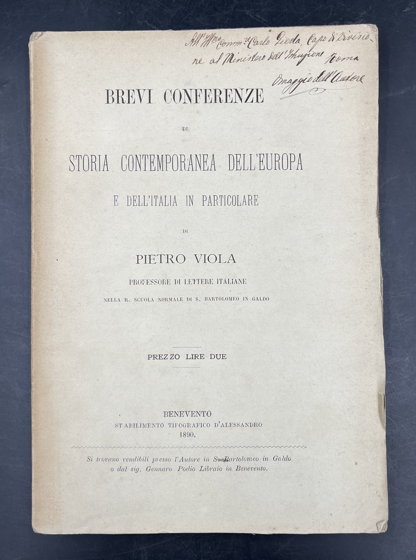 Brevi conferenze di STORIA CONTEMPORANEA dell'EUROPA e dell'ITALIA in particolare. In cop. DEDICA AUTOGRAFA dell'Autore a Carlo Gioda Capo Divisione al Miunistero dell'Istruzione.