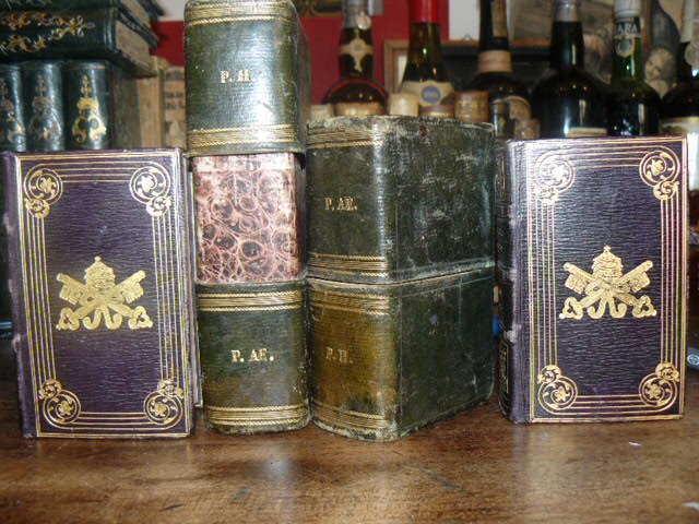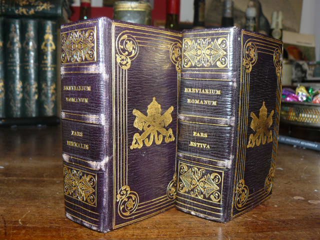 Due voll. in 32° (cm. 11 x 7), pp. (36),662,CCXXXII;(90),586,CCXLI, testo su due colonne in rosso e nero, ai frontespizi emblema papale in xilografia. Bella e affascinante legatura in piena pelle color avana scuro, dorso con ricchi fregi in oro, ai piatti più cornici lineari concentriche, armonizzate agli angoli da motivi geometrici e floreali, al centro emblema Papale in oro, tagli dorati, custoditi in involucri dell'epoca in piena pelle verde con fregi e monogrammi in oro ai dorsi. Ottimi esemplari.