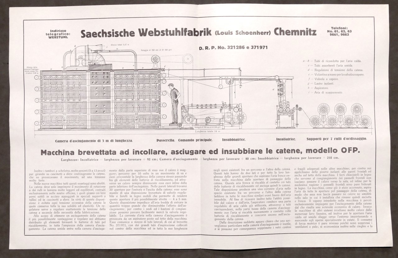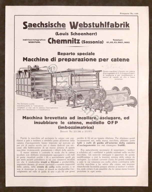 Brochure Industria Tessile Saechsische Webstuhlfabrik - Chemnitz - Macchine di preparazione per catene - anni '20 Pag. 4 Lingua italiana. Condizioni molto buone.