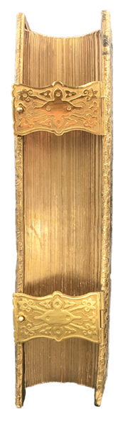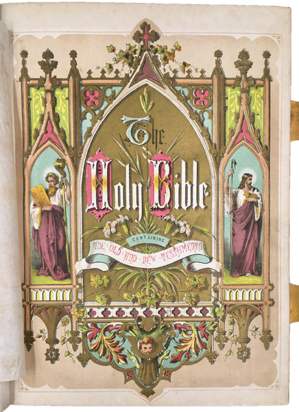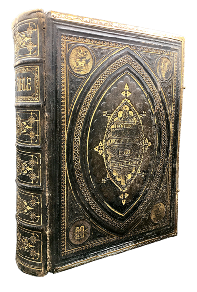 Sontuosa LEGATURA editoriale in piena pelle con CORNICE in METALLO dorato e sbalzato a ornamenti ai bordi dei due piatti, che sono muniti di robusta e raffinata chiusura con 2 FERMAGLI METALLICI sagomati e cesellati con solide cerniere e agganci dorati; 5 nervi, gran titolo e ricchissimi riquadri di fregi al dorso. Piatti molto spessi con titolo in oro (parzialmente sbiadito) entro una complessa ornamentazione a secco a forte rilievo e oro a forma di mandorla e con titolo e medaglioni in oro entro cornice ornata in oro. Tagli doviziosamente dorati. In-4° grande (cm. 34x25x8 allesterno, cm. 32x24 allinterno). Pp. XIV + LXXXII +25, (1b) + 1123 + 25 fitte pagine: A concise BIBLICAL CYCLOPEDIA. Prima del frontespizio del New Testament, 6 pagine non numerate del FAMILY REGISTER, in speciale carta liscia FIGURATA e ornata in oro con motti su cartigli e al centro, a penna, le date di nascita e i nomi dei membri della famiglia, luogo e data matrimonio 7. Sett. 1878, nascita del primo figlio (24 ott. 1878), decessi del primo figlio a 14 anni e 10 mesi, del secondo a 7 anni e 10 mesi; della moglie, a 60 anni nel 1916. Ci sono 37 TAVOLE CROMOLITOGRAFICHE, tra cui il sontuoso antefrontespizio figurato e dorato (protetto da velina), 24 non numerate (inclusa lantiporta) con SCENE BIBLICHE (alcune con menzione della litografia: J. M. Kronham & C., Adam & Co. di Newcastle on Tyne) e 12 numerate fuori testo (su 13: non risulta la VI, certo per errore editoriale) con decine di illustrazioni (VEDUTE di località, animali, sacre suppellettili, piante, monete, costumi, guerrieri ecc.).