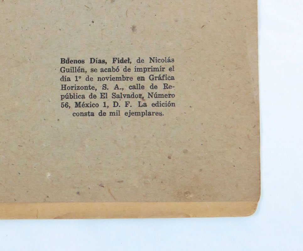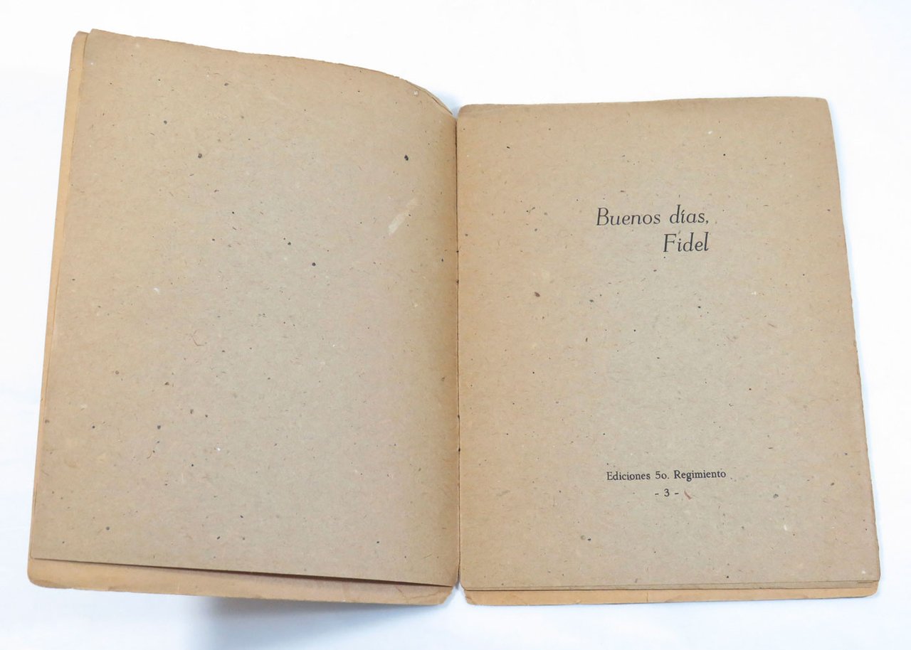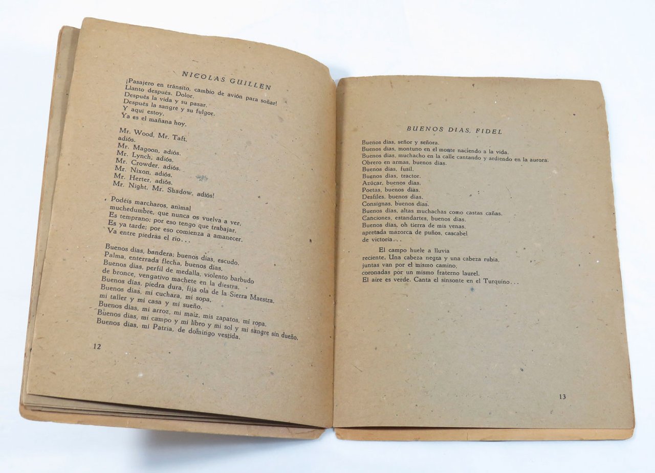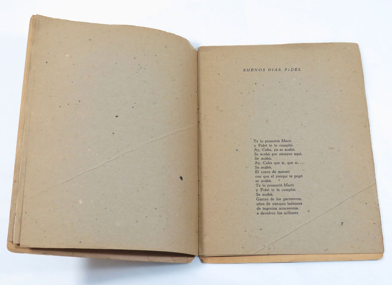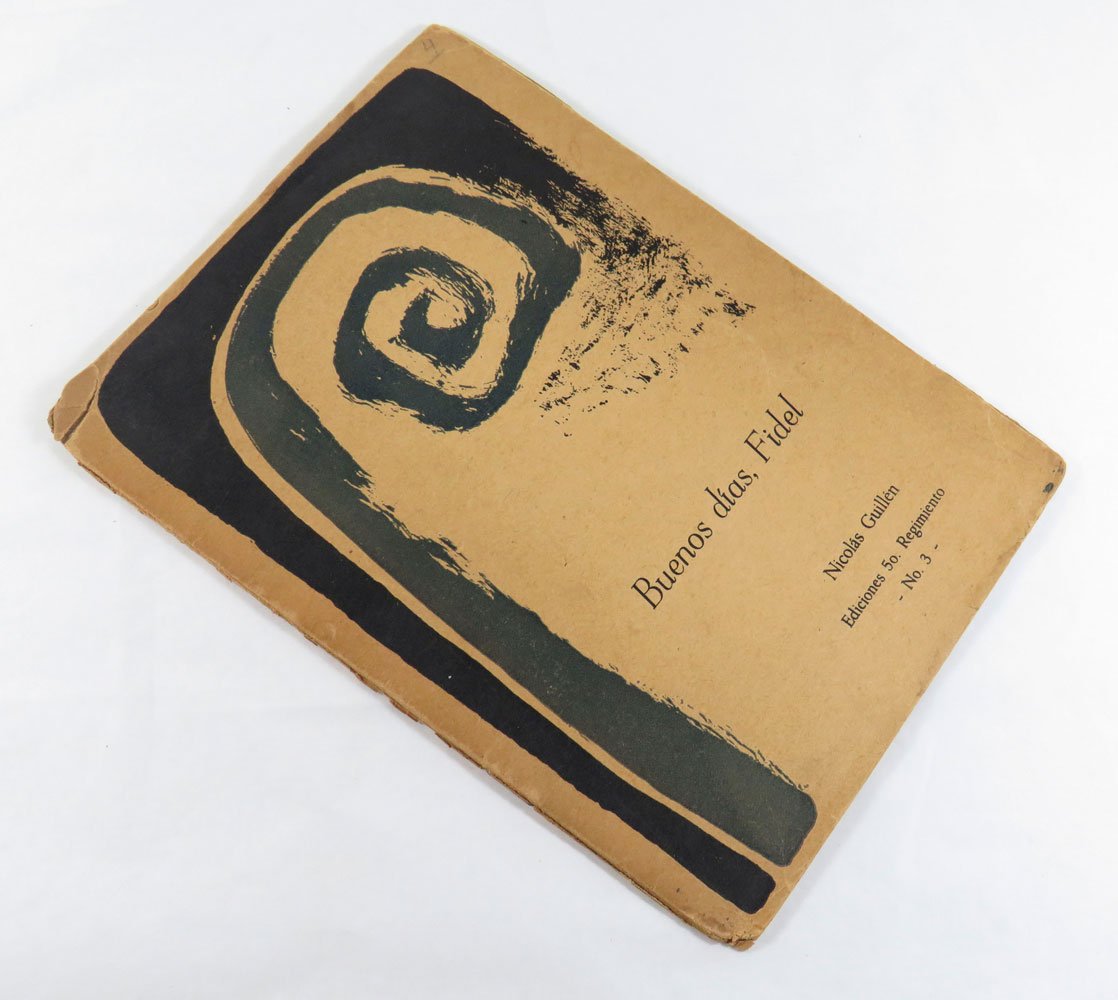 LIBRO Edizione originale. Esemplare uniformemente brunito e in parte fragile per via del tipo di carta utilizzato dall’editore; in più che buone considizioni. Rarissima placchetta poetica con cui il massimo poeta cubano rende omaggio a Castro, appena assurto al potere nell’isola in seguito alla rivoluzione. Due soli esemplari in Oclc (British e Albany Univ). -- Contiene due poesie, «Se acabó» e il componimento eponimo, di cui in particolare la seconda è un omaggio non tanto al líder máximo, quanto alla terra cubana e alle sue tipicità naturali e rustiche, contrapposte velatamente all’America capitalista, salutata con una serie di “adiós” indirizzati a nomi illustri dell’establishment statunitense. La sigla editoriale «Ediciones 5o. Regimiento» — che prende il nome dall’editrice madrilena della milizia popolare Quinto Regimiento, nota brigata militare comunista a difesa della repubblica durante la guerra civile spagnola (1930-1939) — pubblica una manciata di libretti poetici a cavallo del 1960.