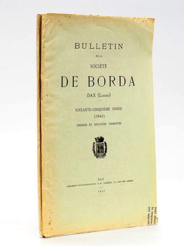 2 vol. in-8 br., Imprimerie P.-H. Labèque, Dax, 1938, XXXII-168 pp. Bulletin de la Société de Borda Dax (Landes) Bulletin de la Société de Borda Dax (Landes) Soixante-Cinquième Année (1941) (4 Trimestres en 2 volumes - Année 1941 Complète) [ Contient notamment : ] Béarn, et Gascogne : Adour, Pyrénées, Navarre ? ou Béarn et Gascogne ? ; Histoire Révolutionnaire d'une commune disparue : Saint-Vincent-de-Xaintes ; La réaction Thermidorienne dans les Landes (suite) ; La Boulepsithérie ; Traitement de l'Epilepsie par le souffle des Vaches en 1809 ; Formation de quelques municipalités au payx de Brassens en 1790 ; Un faux-portrait de Borda dans un ouvrage scientifique ; Promenade historique en Saubestre Bon exemplaire bien complet des 4 trimestres pour l'année 1938. La société de Borda est un célèbre société savante de Dax, dans les Landes. Elle a été nommée en l'honneur de deux savants du XVIIIe, natifs de Dax : Jean-Charles de Borda (1733-1799) et Jacques-François de Borda d'Oro (1718-1804).