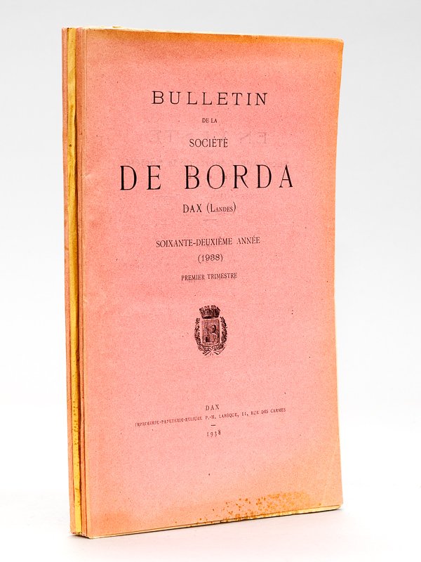 4 vol. in-8 br., Imprimerie P.-H. Labèque, Dax, 1938, XXXII-168 pp. Bulletin de la Société de Borda Dax (Landes) Soixante-Deuxième Année (1938) (4 Trimestres - Complet) [ Contient notamment : ] Le Grand : Nouveaux Documents sur les courses dans le Sud-Ouest jusqu'au XIXe siècle ; Estalenx : Un adversaire du rebelle Audijos (5 janvier 1666) ; Le Pèlerin du XIIe siècle dans les Landes ; Milliès-Lacroix : La petite histoire de Dax ; Mariage des Demoiselles d'Orléans ; Napoléon Bonaparte a-t-il été élu député des Landes ; M. Dantin de Saint Pée, Lieutenant du Roy des Châteaux et Cités d'Acqus et St-Sever ; Entrée de Mgr de la Neufville (1772) ; La Réaction Thermidorienne dans les Landes (suite) ; Le clergé de Mont-de-Marsan en 1791 ; Les coupes de bois de pins dans les Landes au milieu du XVIIIe siècle Bon exemplaire bien complet des 4 livraisons pour l'année 1938. La société de Borda est un célèbre société savante de Dax, dans les Landes. Elle a été nommée en l'honneur de deux savants du XVIIIe, natifs de Dax : Jean-Charles de Borda (1733-1799) et Jacques-François de Borda d'Oro (1718-1804).
