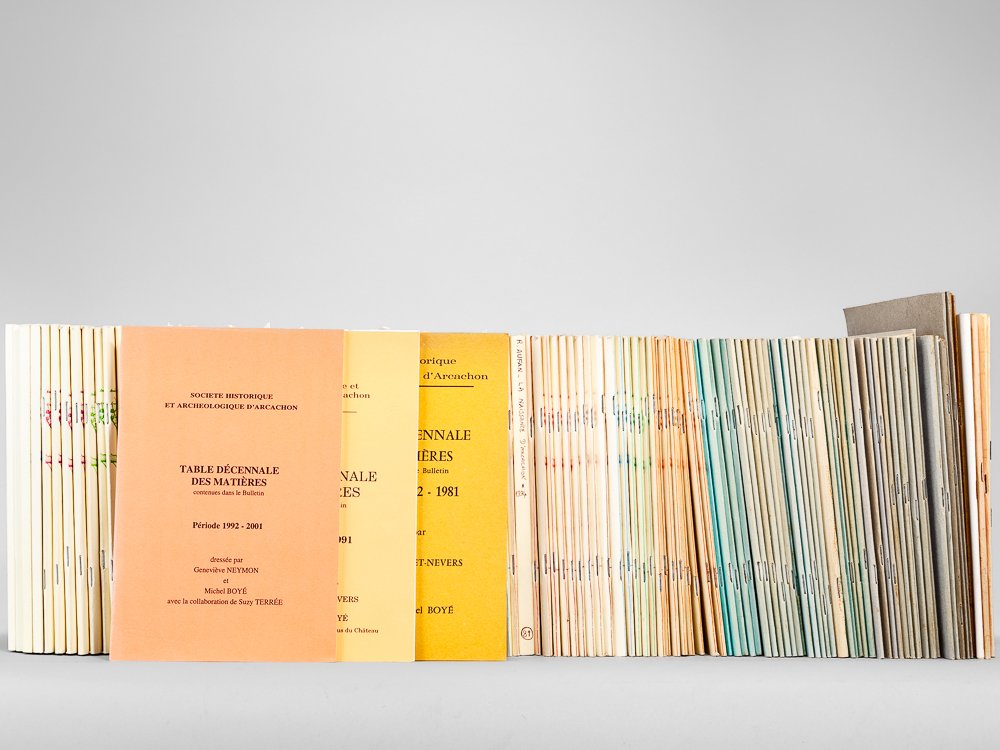 133 vol. in-8 br., Bulletin de la Société Historique et Archéologique d'Arcachon et du Pays de Buch, 1972-2007. Du numéro de juillet 1972, puis années 1973, 1974, 1975, 1976, 1977, 1978, 1979, 1980, 1981, 1982, 1983, 1984, 1985, 1986, 1987, 1988, 1989, 1990, 1991, 1992, 1993, 1994, 1995, 1996, 1997, 1998, 1999, 2000, 2001, 2002, 2003, 2004, 2005, 2006, jusqu'à novembre 2007 Rare et bel ensemble suivi en très bon état, proposant les 133 premiers numéros (à l'exception du numéro 1). On y joint les 3 Tables décennales pour les périodes 1972-1981, 1982-1992 et 1992-2001. Prix du lot, non séparable.